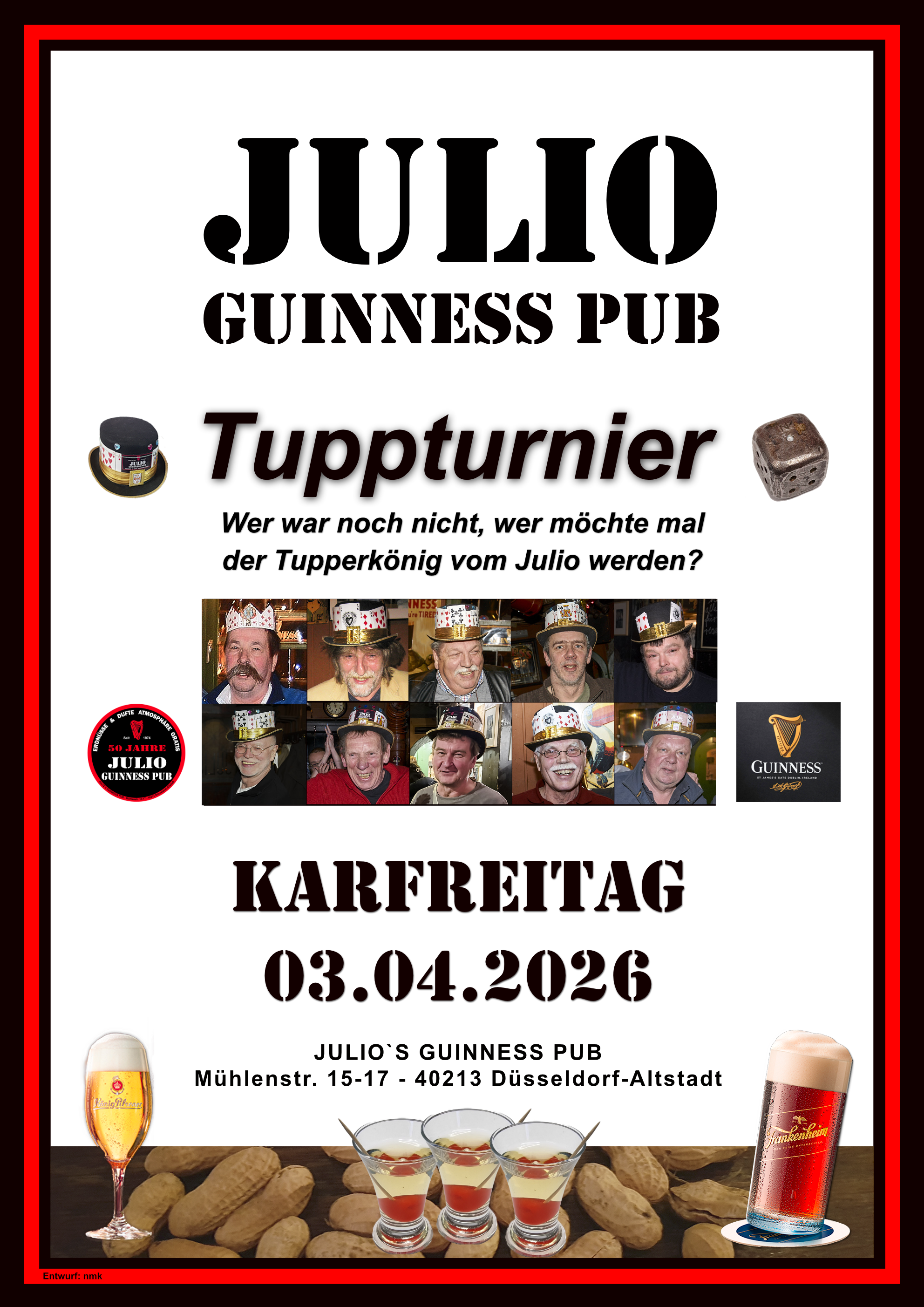 An Karfreitag, dem 18.04.2025, kamen die Tupper-Stammgäste des Julios wieder zusammen, um traditionell einen neuen König zu küren. Insgesamt hatten sich 13 Teilnehmer gemeldet. Darunter auch Martin, der es sich nicht nehmen ließ, extra aus den USA anzureisen, um an dem Turnier teilzunehmen, sowie die Rookie Wiki, die zum ersten mal an dem Turnier teilnahm.